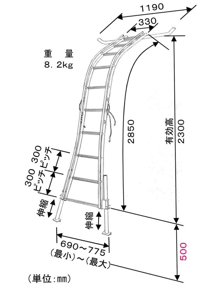 ハウスのシートと接触する部分はクッション被覆付でシートを傷めません。ハの字に開いた脚部と安全ロープで安定性、安全性がアップしました。左右の脚の高さを別々に無段階調整できます。