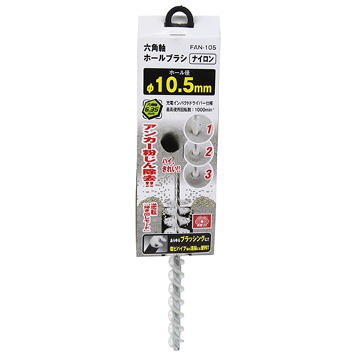 ●ホール径:10.5mm。●適応下穴径:10.5mm。●ブラシ長:60mm。●軸長:110mm。●線径:0.4mm。●軸:六角軸6.35mm。●最高使用回転数:1000min-1。●毛材:白ナイロン66。