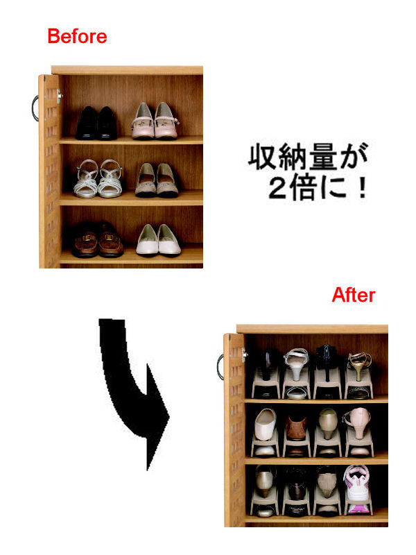 狭い下駄箱スペースを有効活用。収納量が2倍に。 靴のかかと部分にストッパーがあります