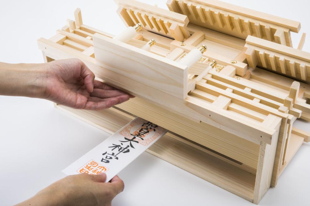 20年毎に行われる伊勢神宮 式年遷宮の外宮に使用されるいる銘木「東濃桧」 この神棚は東濃桧を贅沢に使用し製作されております。 扉などの金具には真鍮製の本金具を贅沢に使用しており自然な金色の輝きを放っています。 御神札は底部のスライド板を動かしてお収めください