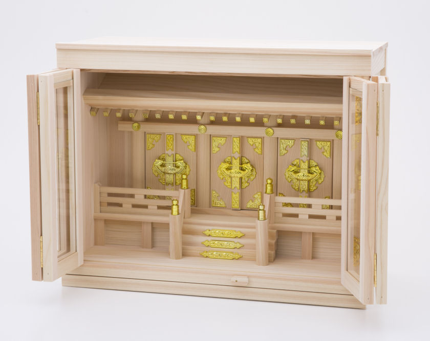 北海道や関東方面で人気のある箱型三社神棚です。 ガラス入りの観音扉で開閉する為埃や汚れが付きにくくお掃除簡単な神棚です。
