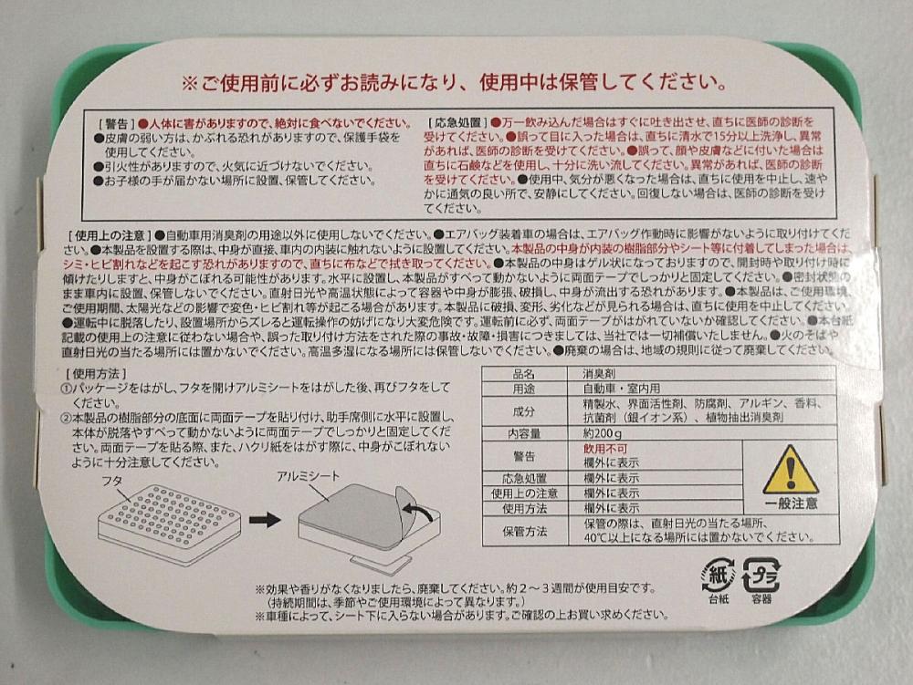 自動車用消臭剤の用途以外に使用しないでください。