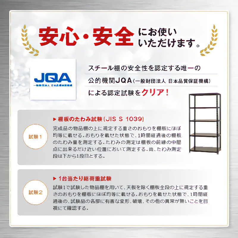 ●スチール棚の安全性を認定する唯一の公的機関JQAによる認定試験をクリア