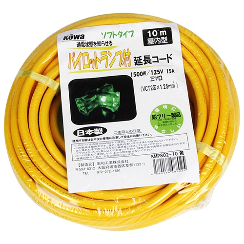●定格:15A・125V。●コンセント:2PX3ツ口。●色:黄。●電線サイズ:VCT2芯X1.25sq。●長さ:10M。●屋内用。●導体:銅線。●栓刃:黄銅。●被覆:塩化ビニル。