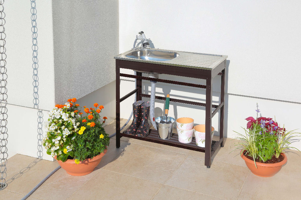 ●シンクはお手入れ簡単なステンレス製。 ●下棚付で園芸用品などの道具を置くのに便利です。 ●ホースホルダー付なので、お手持ちのホースやホースリールなどをひっかければ、蛇口から離れた場所でも水の使用ができます。 ●お庭になじむ落ち着いたマットブラウン。