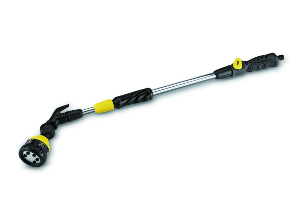 ・先端部を回すことで、6種類の散水パターンを選択できます。手元レバーでは水量調節(0~100%)が可能です。ノズルヘッドは0~180°の範囲で散水角度を変えることができます。さらに、伸縮タイプなので最大105cm先まで散水できます。 【実寸】長さ79cm~113cm 幅65mm