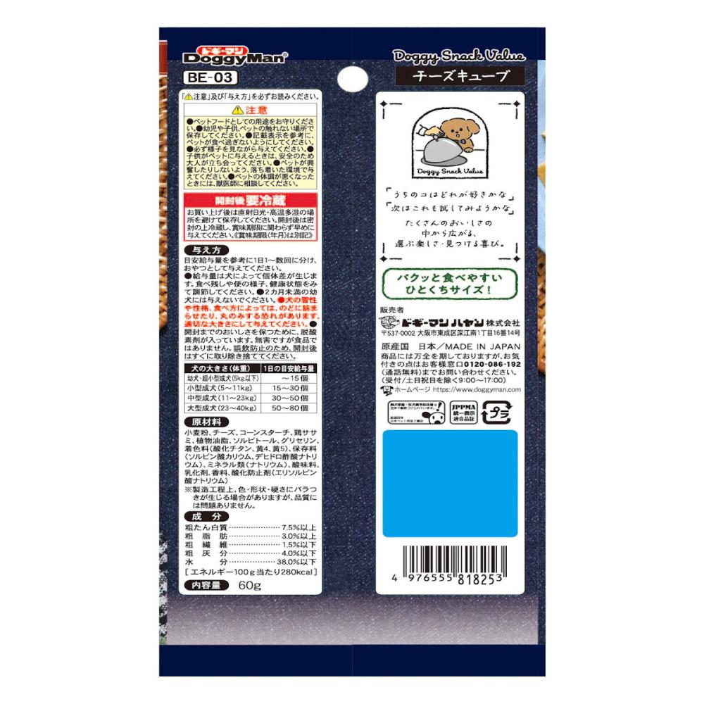 原材料:小麦粉、チーズ、コーンスターチ、鶏ササミ、植物油脂、ソルビトール、グリセリン、食用色素(酸化チタン、黄4、黄5)、保存料(ソルビン酸カリウム、デヒドロ酢酸ナトリウム)、ミネラル類(ナトリウム)、酸味料、香料、酸化防止剤(エリソルビン酸ナトリウム)
