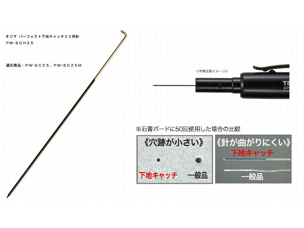 強くて細いフッ素樹脂加工針の為、壁の傷を最小限に抑えます。