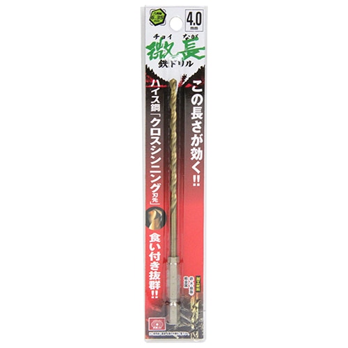 ●サイズ:4.0mm。●標準穴あけ可能厚:(鉄)2.0mm・(木)らせん溝長の2/3程度。●軸:六角軸6.35mm。●使用電動工具:充電式インパクトドライバー・ドリルドライバー・電気ドリル。●加工材料:鉄・木・樹脂・軽金属。