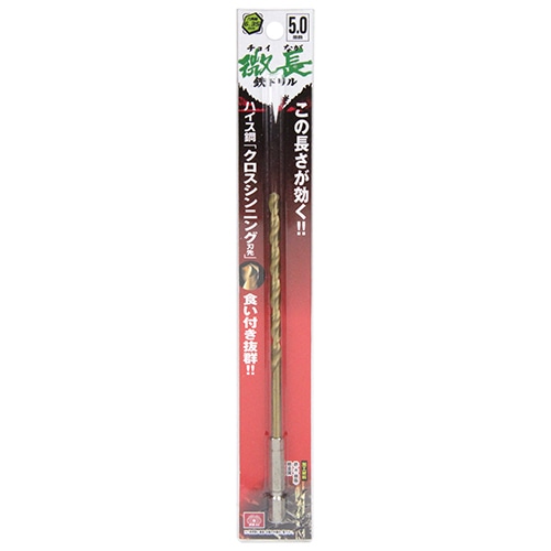 ●サイズ:5.0mm。●標準穴あけ可能厚:(鉄)2.0mm・(木)らせん溝長の2/3程度。●軸:六角軸6.35mm。●使用電動工具:充電式インパクトドライバー・ドリルドライバー・電気ドリル。●加工材料:鉄・木・樹脂・軽金属。