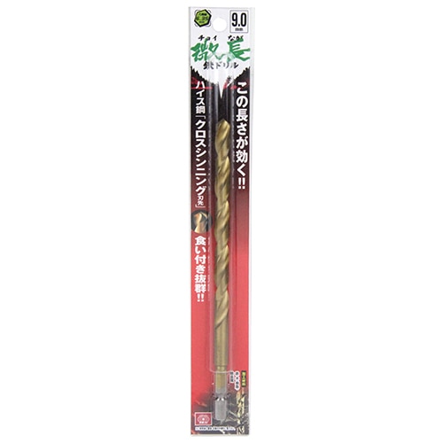 ●サイズ:9.0mm。●標準穴あけ可能厚:(鉄)2.0mm・(木)らせん溝長の2/3程度。●軸:六角軸6.35mm。●使用電動工具:充電式インパクトドライバー・ドリルドライバー・電気ドリル。●加工材料:鉄・木・樹脂・軽金属。