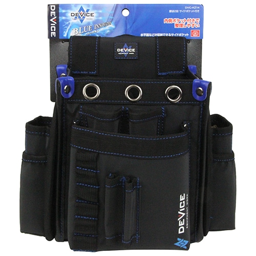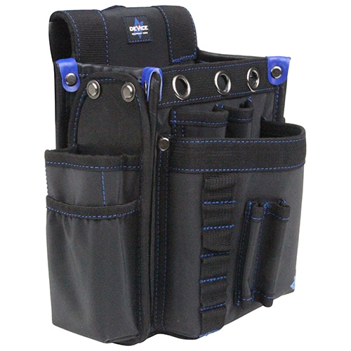 内側ポケット付きで整理しやすいです。バックスリット仕様のベルト通しです。開口部リベット補強で丈夫です。耐久性・耐摩耗性を両立したターポリン生地を採用しています。水平器などが収納できるサイドポケット付きです。
