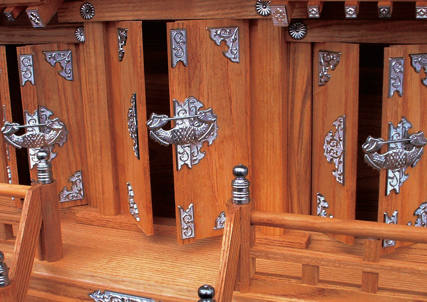 ●中央扉(内寸):約幅145×奥行63×高さ310mm 左右扉(内寸):約幅125×奥行48×高さ255mm●適応棚:棚板 大●適応幕:幕40号、幕50号●適応神具:神具12点セット
