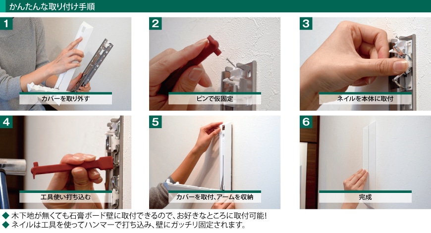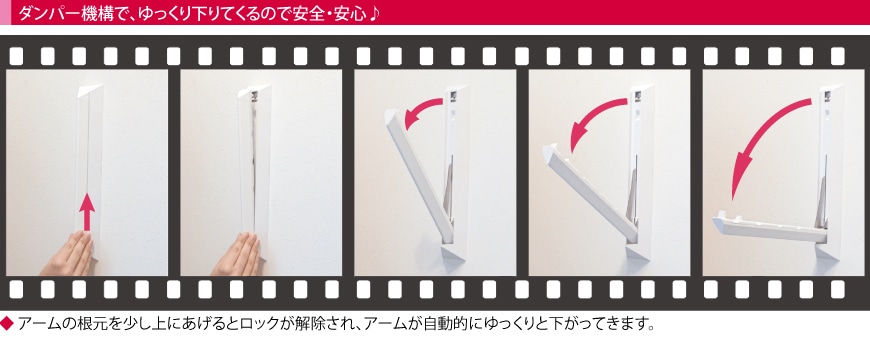物干しを連想させないスタイルでどんな部屋にも合う壁面物干し。少量の洗濯物なら竿を設置ぜずに手軽に干すことができ、使用しない時はアーム部分をスッキリ収納。アーム部分はダンパー機能による安全機能付きです。2本使用時の耐荷重は10kg。