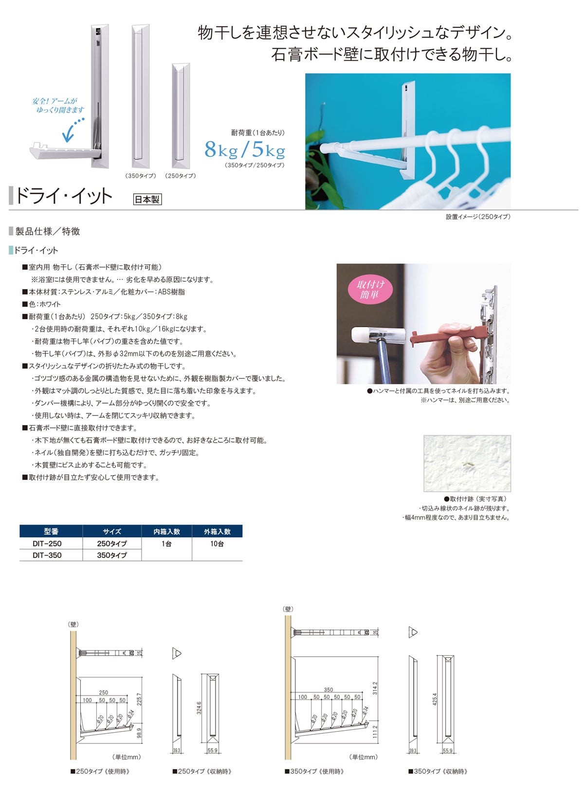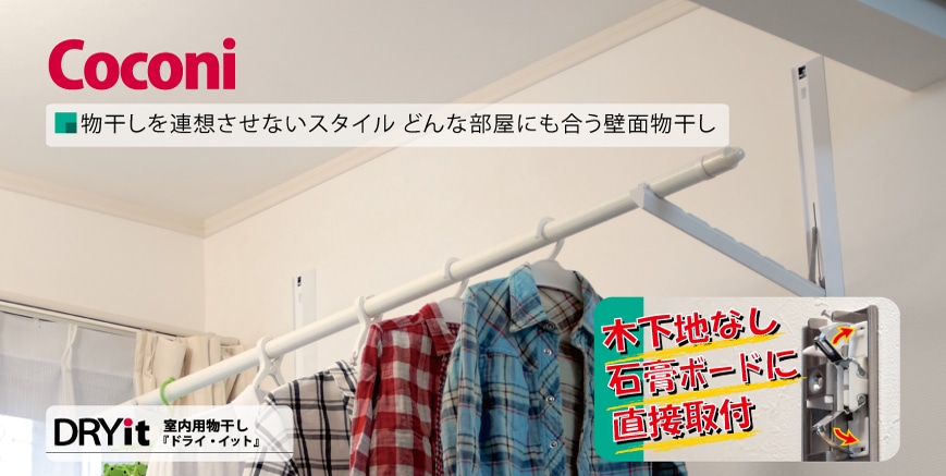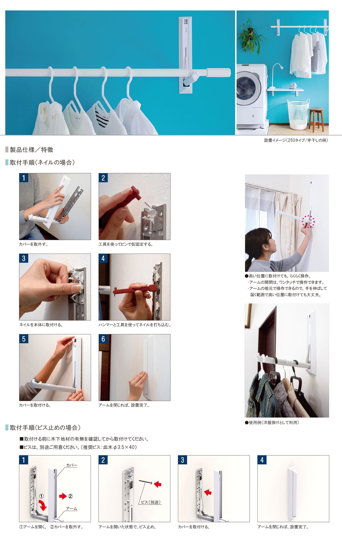 物干しを連想させないスタイルでどんな部屋にも合う壁面物干し。少量の洗濯物なら竿を設置ぜずに手軽に干すことができ、使用しない時はアーム部分をスッキリ収納。アーム部分はダンパー機能による安全機能付きです。2本使用時の耐荷重は16kg。