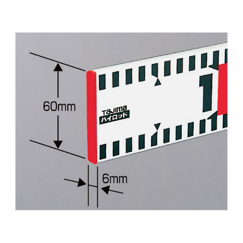 ●表面:縦目盛。●裏面:横目盛。●幅:60mm。●厚さ:6mm。●精度:±{1.0+(L-1)mm}L=測定長(m)。●本体:アルミ。