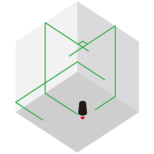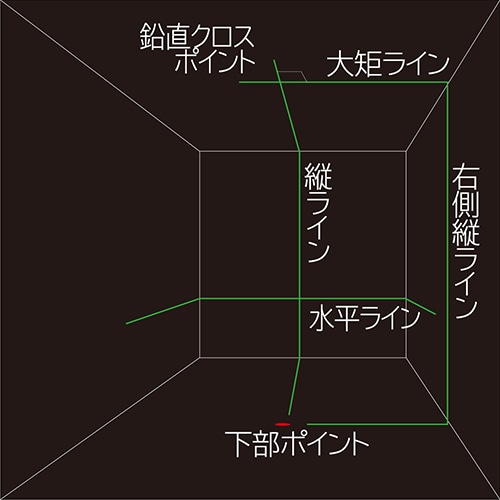 ●鉛直点精度:3mで±1mm以内。●直角精度:90度±(2mm/7.5m)。●自動補正範囲:±2度。●ライン出射角:縦130度・水平110度。●精度:±0.81mm/10m。●外装:ABS樹脂。