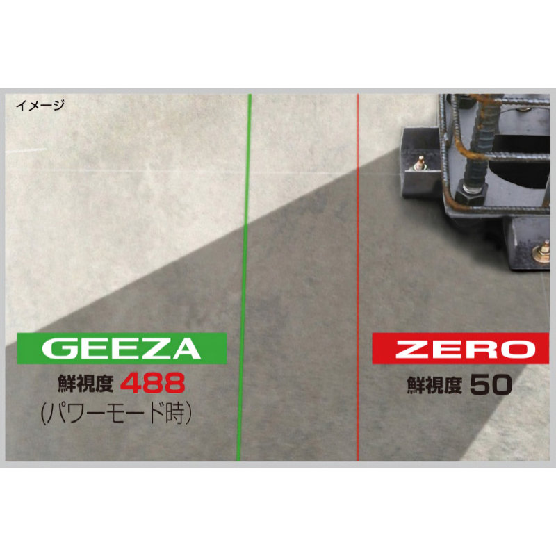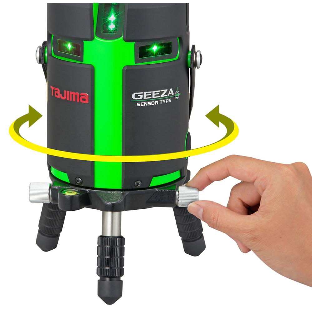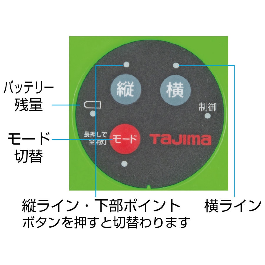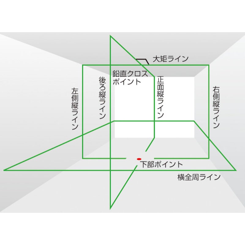 ●照射ライン:縦(前後左右)・横全周・大矩・ポイント(鉛直・下部)。●制御方式:センサー方式。●精度:±0.81mm/10m。●鉛直点精度:3mで±1mm以内。●左右通り精度:15mで±2mm以内。●モード切替:(セーブモード)鮮視度188・電池寿命19h、(ジャストモード)鮮視度300・電池寿命14h、(パワーモード)鮮視度488・電池寿命10h。●直角精度:90度±(2mm/7.5m)。●自動補正範囲:±2度・ライン出射角:縦130度/横110度。●外装:ABS樹脂。