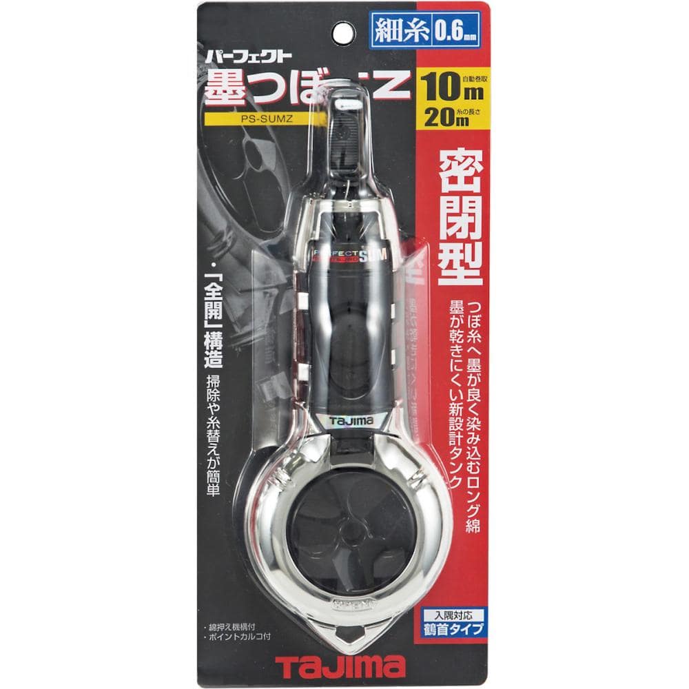 ●糸の長さ:20m。●自動巻取糸長さ:10m。●糸の太さ:0.6mm。●墨タンク最大容量:20ml。●付属カルコ:糸巻取り時、針が自動的に収納するポイントカルコ標準装備。●外装:ABS樹脂。●糸:ナイロン。