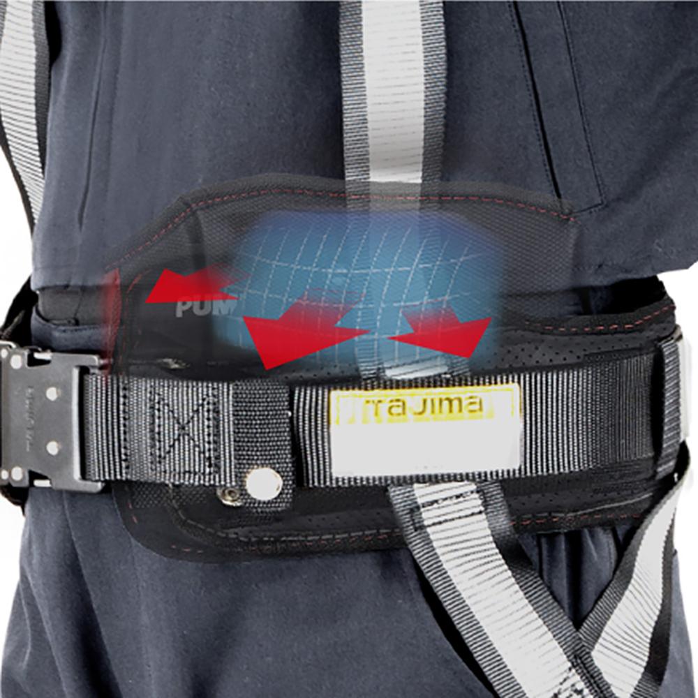 ハーネス・サスペンダーと簡単に取付け取外しが可能です。装着スペースを阻害しないDJ(ダイレクトジョイント)機構です。腰の隙間を埋める高耐久エアクッションを搭載しています。空気量を調整できるエアポンプ内蔵です。ズレにくいノンスリップ構造です。