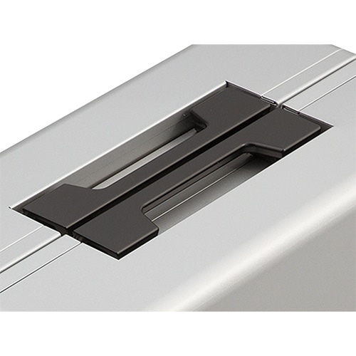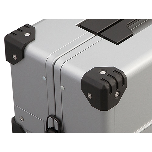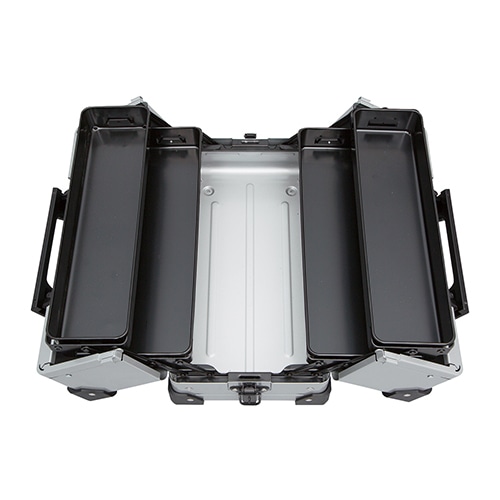 オープン時に内蔵されたトレイが左右に展開し、収納物を一覧できる両開きタイプの工具箱です。フラットに収納されるビルトインハンドルは、起こしたり倒したりする必要がなく、スピーディーに持ち運べます。ビルトインハンドルは軽量で耐久性に優れたアルミダイキャスト製で、シャープなデザインでありながら手の当たる部分に丸みを付けて持ちやすくしています。取り外して持ち運び可能な可搬式のキャリングトレイ(上段)と固定トレイ(下段)が左右に一つずつ、計4つ設けられています(可搬式トレイの取っ手はついていません)。コーナーは車のトランクやフローリング等を傷付けないラバー製のパッドを採用しました。