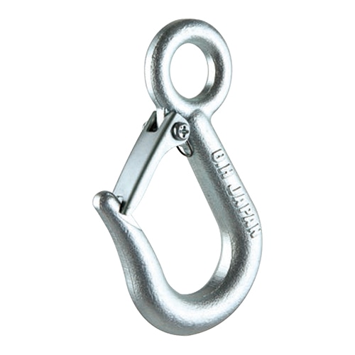 小径アイボルトに通るスリムタイプなアイフックです。横方向からの荷重に強い安全レバー付です。
