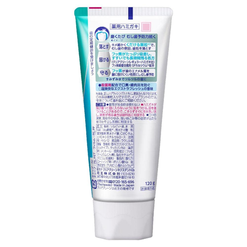 原材料・成分:基剤:ソルビット液、水 清掃剤:Wa顆粒*1、無水ケイ酸 粘土調整剤:無水ケイ酸、CMC・Na、ヒドロキシエチルセルロース 湿潤剤:PEG-12 発泡剤:ラウリル硫酸塩 香味剤:香料(エクストラフレッシュタイプ)、サッカリンNa 薬用成分:フッ化ナトリウム*2、塩化セチルピリジニウム*3、 着色剤:酸化Ti 洗浄剤:ミリストイルグルタミン酸Na コーティング剤:ポリリン酸Na 清掃助剤:無水ピロリン酸Na