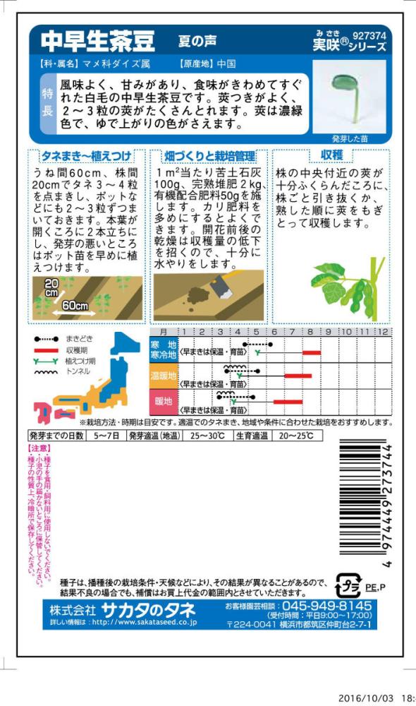 風味よく、甘みがあり、食味がきわめてすぐれた白毛の中早生茶豆です。莢つきがよく、2~3粒の莢がたくさんとれます。莢は濃緑色で、ゆで上がりの色がさえます。