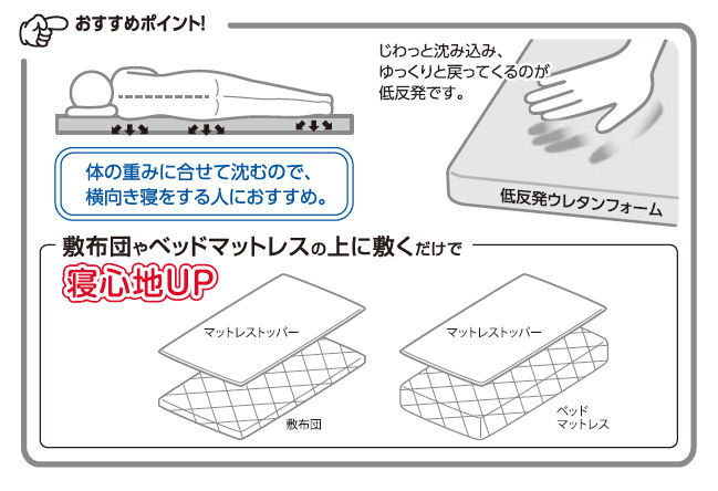■低反発ウレタンフォームが体の重みやラインに合わせて沈みこみます。包まれるようにじわっと沈み込む感覚が心地よいマットレストッパーです。