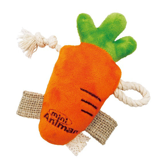 かじるところは天然素材でできています。ウサギが怖がらないようにぴゅーぴゅー笛は入っていません。ウサギ専用のかじって遊ぶおもちゃ。カワイイにんじん型で遊んでいる姿はSNS映え間違いなし!