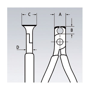 ●ヘッド仕上げ:黒防錆コート、磨き●ハンドル仕様:プラスチックコーティング●切断面:傘状●切断能力(軟線;径mm):0.4-2.0●切断能力(中硬線;径mm):1.3●切断能力(硬線;径mm):1.0●切断能力(ピアノ線;径mm):0.8●寸法A(mm):16●寸法B(mm):7.5●寸法C(mm):20●寸法D(mm):10●全長(mm):130●質量(g):111●軟線、硬線さらに細いピアノ線を切断することができます。●ジョイント部は2枚合わせでスムーズに可動します。●入念な焼入れ処理が施された刃の硬度は約HRC64。●材質はオイル焼き入れ焼き戻し処理済みのクロムバナジウム電気鋼。●メカニック用。