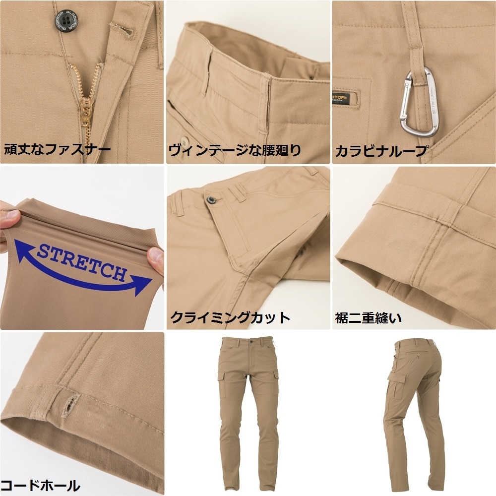 股が裂けづらく動きやすい仕様。カラビナループ付き。丈夫な巻き二重縫い。