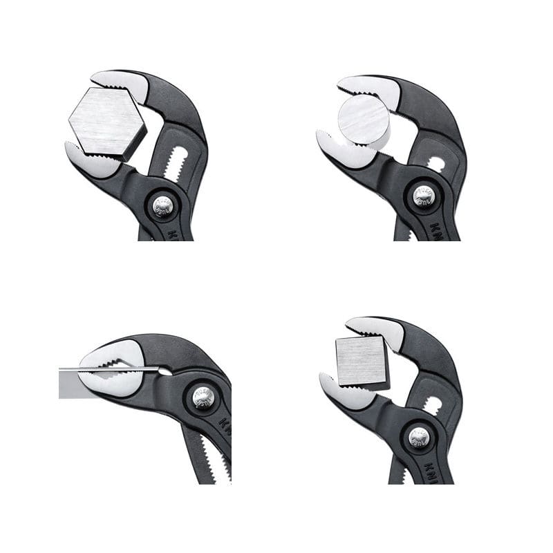●ヘッド仕上げ:クロムメッキ●ハンドル仕様:プラスチックコーティング(滑り防止仕上げ)●つかみ面:横すじ入り●調整段数:18●パイプつかみ能力(径mm):42●ナットつかみ能力(mm):36●全長(mm):180●質量(g):175●KNIPEXの“コブラ”は高性能なウォーターポンププライヤーです。●ジョイント部は横方向へのブレを防止する3枚合わせ(ボックスジョイント)。●プッシュボタンにより、素早く簡単にアゴの幅を細かく調整できます。●アゴの開き調整はプッシュボタンにて行うため、作業中は不意に口幅が変わらないので早く快適に作業ができます。●アゴの開きは片手で調節が可能です。●上のアゴを対象物にあて、プッシュボタンを押しながら、下アゴを上にスライドさせるだけで簡単に調整することができます。●口幅を最大に調節して握っても、ハンドルの間にクリアランスを確保する指詰めストッパー付き。●少ない力でパイプやナットを確実につかむ平行四辺形のアゴ形状。●てこの原理を最大限発揮するデザインで高いグリップ力を発揮します。●入念な焼入れ処理が施されたつかみ面の硬度は約HRC61で、耐磨耗性が高く、確実なグリップを発揮します。●材質はオイル焼き入れ焼き戻し処理済みのクロームバナジウム電気鋼。