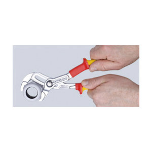 ●ヘッド仕上げ:クロムメッキ●ハンドル仕様:1000V絶縁(VDE絶縁テスト済み)●つかみ面:横すじ入り●パイプ容量(径inch):2●ナット開口範囲(mm):46●パイプ開口範囲(径mm):50●調節段数:24●全長(mm):250●質量(g):340●掴み面には特殊焼き入れされた歯がつけられています。●歯の硬度は約 61 HRCで、耐摩耗性が高ので、確実な掴みが長期間続きます。●材質はオイル焼き入れ焼き戻し処理済みのクロームバナジウム電気鋼。●鍛造により大変頑丈です。●DIN EN/IEC60900基準に適合。●二種類の素材から成る1000V絶縁ハンドルは赤と黄のツートンカラーを採用することで、非絶縁ツールとの差別化を図っています。●ワークに直接押し当てて設定、素早く、確実に、楽に操作できます。●ワークに触れずに、ボタンプッシュで開きます。●様々な大きさの工作物に最適に適合させるための精密調整と握りやすいハンドルポジション。●ヘッドとジョイント部分のスリムな構造により、ワークへのアクセスにとくに優れています。●パイプやナットにセルフロックするので、ワークから滑り落ちることがなく、力を入れずに作業できます。●ボックスジョイント構造のダブルガイドにより非常に安定しています。●挟み込み防止により、指が挟まれるのを防ぎます。