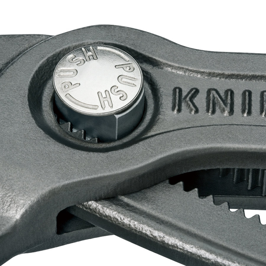 ●ヘッド仕上げ:クロムメッキ●ハンドル仕様:コンフォート●つかみ面:横すじ入り●調整段数:30●パイプつかみ能力(径mm):70●ナットつかみ能力(mm):60●全長(mm):300●質量(g):580●KNIPEXの“コブラ”は高性能なウォーターポンププライヤーです。●ジョイント部は横方向へのブレを防止する3枚合わせ(ボックスジョイント)。●プッシュボタンにより、素早く簡単にアゴの幅を細かく調整できます。●アゴの開き調整はプッシュボタンにて行うため、作業中は不意に口幅が変わらないので早く快適に作業ができます。●アゴの開きは片手で調節が可能です。●上のアゴを対象物にあて、プッシュボタンを押しながら、下アゴを上にスライドさせるだけで簡単に調整することができます。●口幅を最大に調節して握っても、ハンドルの間にクリアランスを確保する指詰めストッパー付き。●少ない力でパイプやナットを確実につかむ平行四辺形のアゴ形状。●てこの原理を最大限発揮するデザインで高いグリップ力を発揮します。●入念な焼入れ処理が施されたつかみ面の硬度は約HRC61で、耐磨耗性が高く、確実なグリップを発揮します。●材質はオイル焼き入れ焼き戻し処理済みのクロームバナジウム電気鋼。●ハンドルは複数の材質で作られたプラスチックカバー付き。※コンフォートハンドル(本品)は絶縁ではありません。