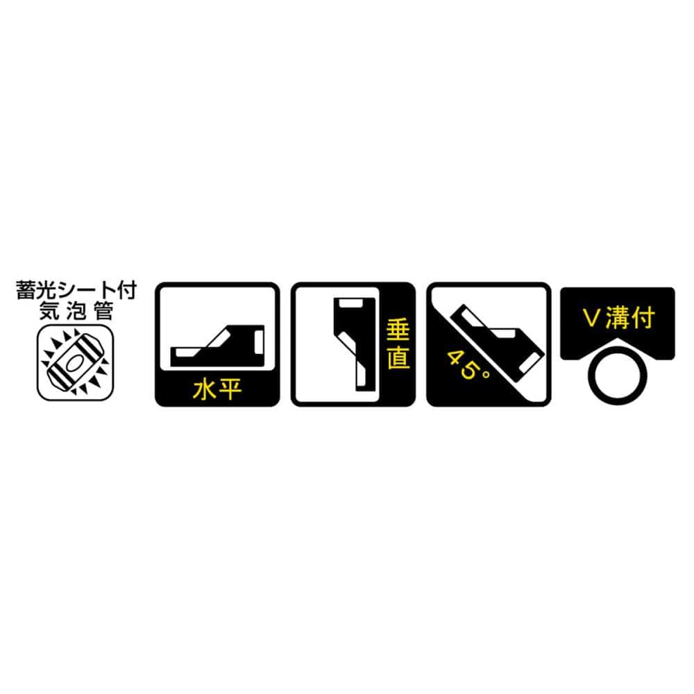 ●水平・垂直・45°の測定に。●精度:±2.5mm/m●感度:0.5mm/m●本体:ABS樹脂・アルミ合金●気泡管:アクリル樹脂(PMMA)