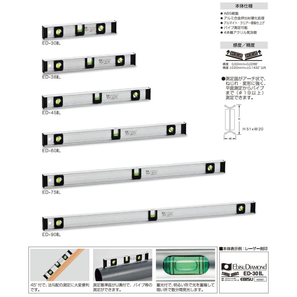 ●水平・垂直・45°の測定に。●精度:±2.50mm/m=±0.1432°以内●感度:0.50mm/m=0.0286°●本体:アルミ合金押出材硬化処理●気泡管:アクリル樹脂(PMMA)●部品:ABS樹脂●長さ(mm):900●高さ(mm):51●厚み(mm):20●マグネット:なし
