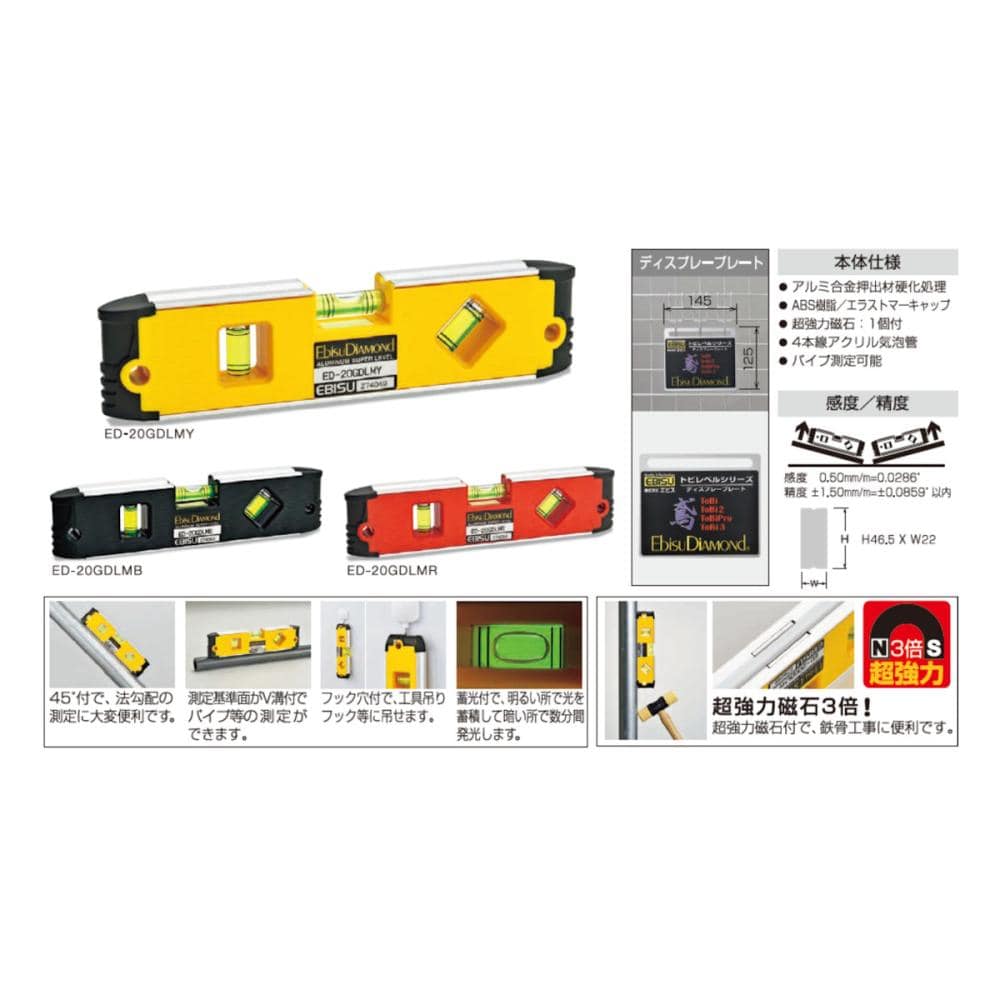 ●水平・垂直・45°の測定に。●精度:±1.50mm/m=±0.0859°以内●感度:0.50mm/m=0.0286°●本体:アルミ合金押出材硬化処理●気泡管:アクリル樹脂(PMMA)●カバー:ABS樹脂・エラストマー樹脂●長さ(mm):200●高さ(mm):46.5●厚み(mm):22●マグネット:1ヵ所●色:レッド