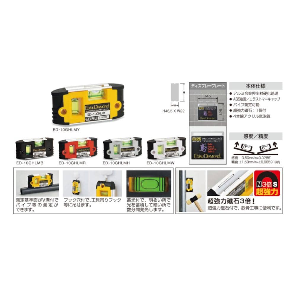 ●水平・垂直の測定に。●精度:±1.50mm/m=±0.0859°以内●感度:0.50mm/m=0.0286°●本体:アルミ合金押出材硬化処理●気泡管:アクリル樹脂(PMMA)●カバー:ABS樹脂・エラストマー樹脂●長さ(mm):100●高さ(mm):46.5●厚み(mm):22●マグネット:1ヵ所●色:イエロー
