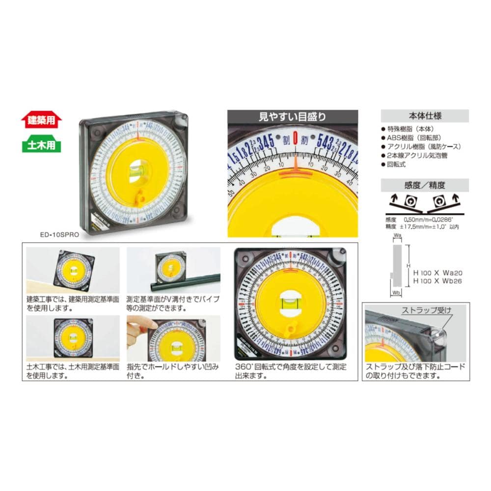 ●角度の測定に。●精度:±17.5mm/m=±1.0°以内●感度:0.50mm/m=0.0286°●本体:特殊樹脂●回転部:ABS樹脂●風防ケース:アクリル樹脂(PMMA)●気泡管:アクリル樹脂(PMMA)●長さ(mm):100●高さ(mm):100●厚み(mm):26●最小読取値:1°