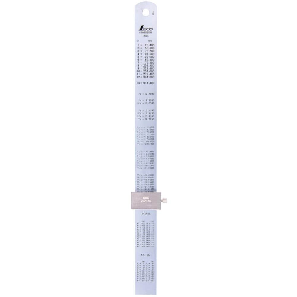 ●ケガキ作業。●ストッパー付●裏面:インチ換算表●ストッパー:真鍮●スケール:ステンレス(SUS420J2)●全長(mm):335●幅(mm):35●厚み(mm):6●呼び寸法(mm):300●上段(ピッチ):1mm●下段(ピッチ):0.5mm●全長(mm):335●幅(mm):35●厚み(mm):6●呼び寸法(mm):300●上段(ピッチ):1mm●下段(ピッチ):0.5mm