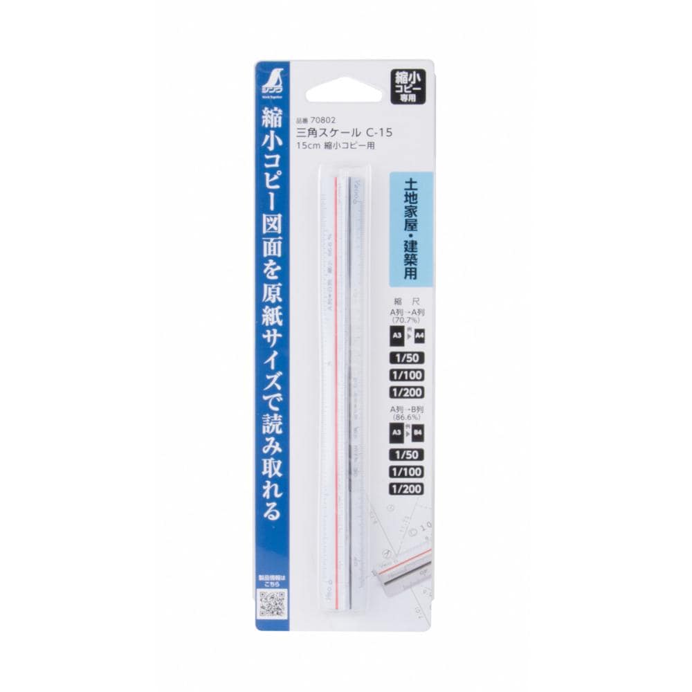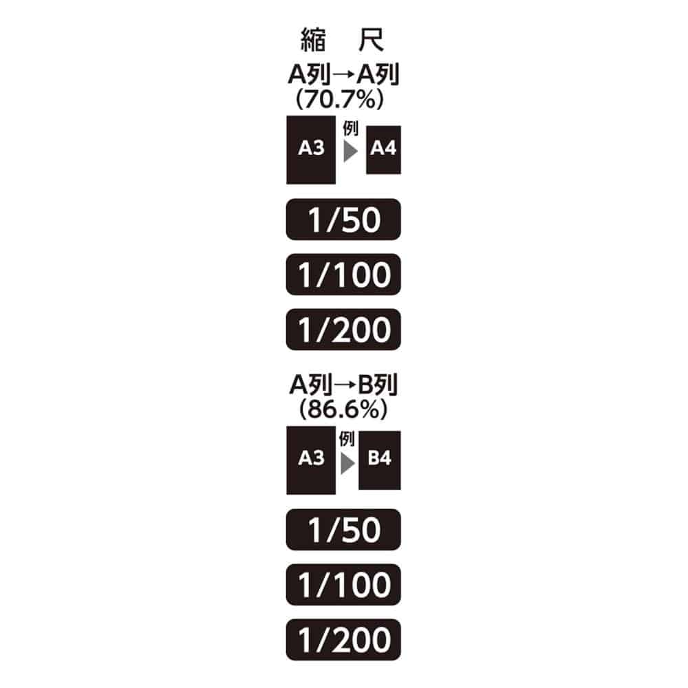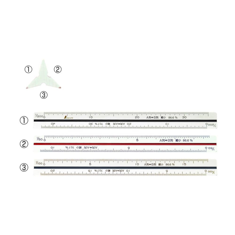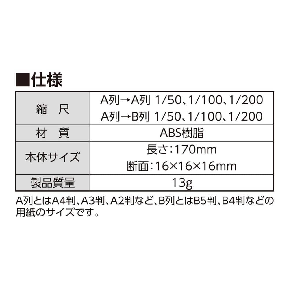 ●図面作成、寸法の読み取りに使用する三角スケール。●1/50、1/100、1/200の縮尺:A列をB列(86.6%)●ABS樹脂●縮尺を間違えないよう注意して下さい。●全長(mm):170●幅(mm):16●厚み(mm):16●呼び寸法(mm):150●1/50、1/100、1/200の縮尺:A列をA列(70.7%)●全長(mm):170●幅(mm):16●厚み(mm):16●呼び寸法(mm):150●1/50、1/100、1/200の縮尺:A列をA列(70.7%)