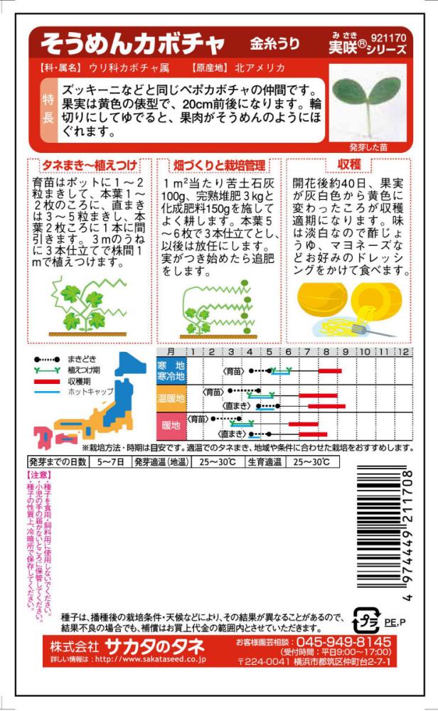 ズッキーニなどと同じペポカボチャの仲間です。果実は黄色の俵型で、20cm前後になります。輪切りにしてゆでると、果肉がそうめんのようにほぐれます。