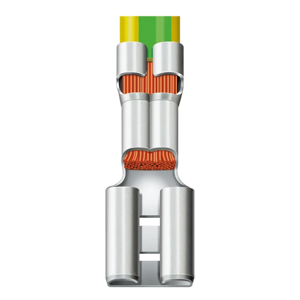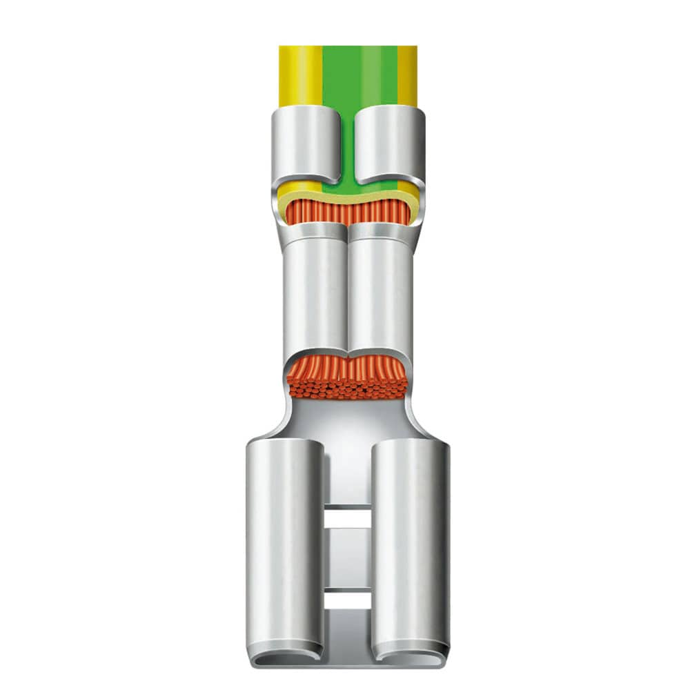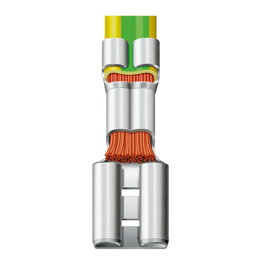 ●ヘッド仕上げ:磨き、黒表面処理●ハンドル仕様:コンフォート●全長(mm):195●クリンピング能力(mm2):0.1-1.5●クリンピング能力(AWG):27-16●圧着段数:4●質量(g):387●オプション品:ロケーター(9759-14)●精密な圧着ダイスと強制ロック(解除可能)により安定した圧着作業ができます。●圧着力は工場で精密に調整(較正)されており、再調整が可能。●トグルレバーによって力を増幅し、作業の疲労を少なくします。●20°に傾いたヘッドは軽量で短い構造なので、大変作業しやすくなっています。●負荷のかかる全パーツはオイル焼き入れ焼き戻し処理済みの高級クロムバナジウム電気鋼。●ハンドルは複数の材質で作られたプラスチックカバー付き。●オープンバレル端子(2.8+4.8mm)用。