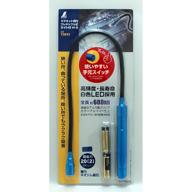 ●金属拾い。●電源:単3アルカリ乾電池×2本(付属)モニター用●ライト付●マグネット:ネオジム磁石●本体(フレキシブルチューブ):鉄●グリップ:アルミ●吸着力(N):20●マグネット径(mm):20●全長(mm):607●表面磁束密度(T):0.37●径×高さ(mm):