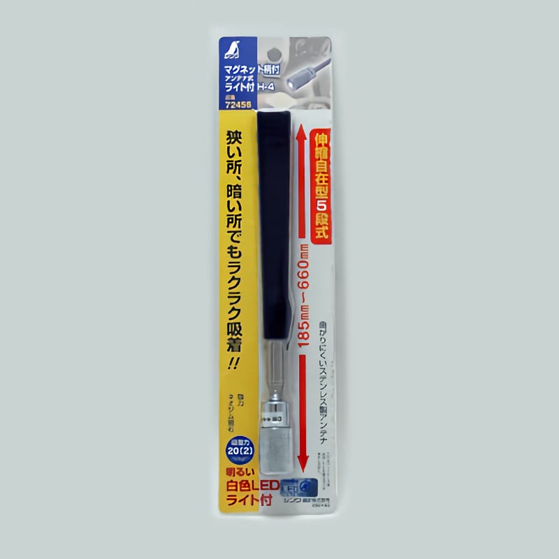 ●金属拾い。●電源:ボタン型アルカリ電池(LR44)×3個(付属)モニター用●ライト付●マグネット:ネオジム磁石●本体:ステンレス●グリップ:ゴム●吸着力(N):20●マグネット径(mm):18●全長(mm):186~660●表面磁束密度(T):0.35●径×高さ(mm):
