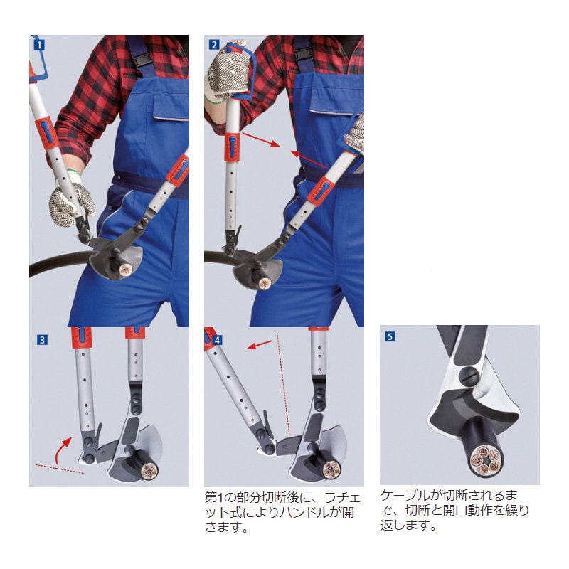 ●ヘッド仕上げ:磨き(黒表面処理)●ハンドル仕様:コンフォート●銅線(多芯)の切断能力(径mm):38●銅線(多芯)の切断能力(mm2):280●切断能力(MCM):550●全長(mm):570~770(伸縮式)●質量(g):1980●交換部品:カッターヘッド(9539-038)●角度調整可能なハンドルにより最適なハンドル幅に調整、狭い作業範囲での作業に最適です。●ラチェット構造により快適に作業できます。●持ち運びの際や作業条件により個別に長さを調整できます。●交換可能なカッターヘッド。●特殊形状のブレードにより、スムーズでシャープに切断できます。●スクリュージョイントは調節可能です。●高負荷に耐えるアルミニウムのオーバルパイプ製の伸縮式ハンドル。●カッターヘッドの材質はオイル焼き入れ焼き戻し処理済みの高級特殊工具鋼。※スチールワイヤーやワイヤーロープの切断はできません。