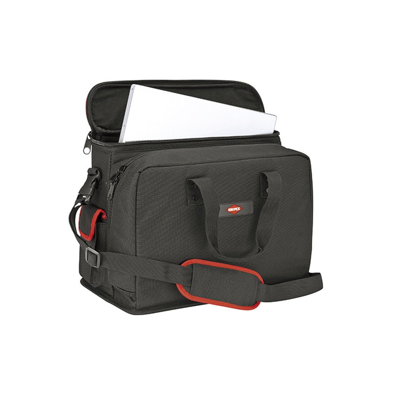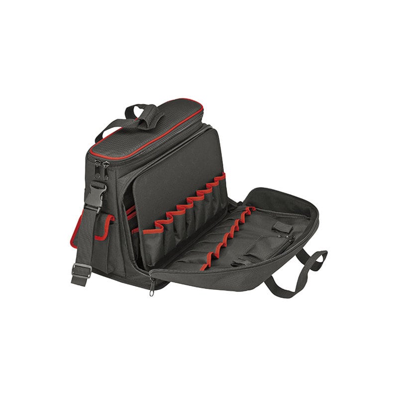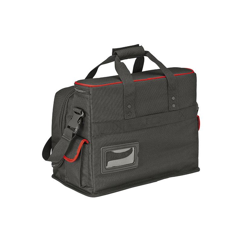 ●サイズ(mm):幅440×高さ200×奥行340●質量(kg):2.7●内側にA4サイズの書類用ポケット、A4サイズのジッパー付仕切り付き。●内側に小さなポケット1つ、8つのツールポーチのついた折りたたみポーチ。●前ポケットの裏面にはツールポーチ5個とペン挿し3個が付いています。●前面に取り外し可能なツールポーチ8個付ツールパネル1個、背面に伸縮性のあるバンド2個付き。●底面は防水です。●クイックリリースファスナーが付いたショルダーベルト。●持ち運び用ループ2個付き。●丈夫なポリエステル布製。●工具の収納やノートの収納に。●出張整備や現場作業に。※工具は付属しておりません。