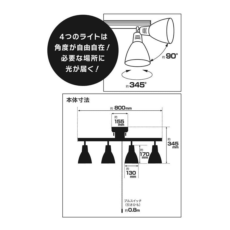 "●4灯、内側2灯、外側2灯の三つのモード切替 ●使用電球例(1つのシェード):白熱球60W以下、電球型蛍光灯15W以下、LED電球10W以下で重さ110g以下"