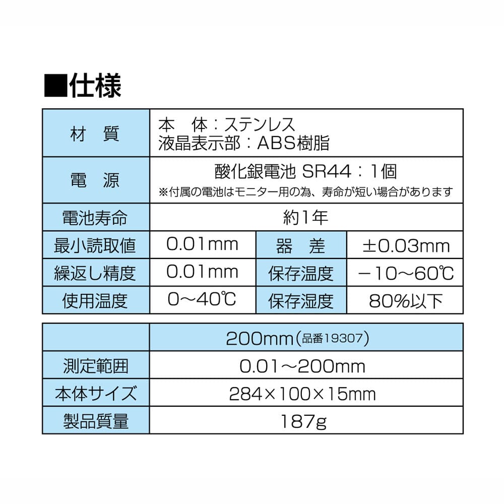 ●深さの測定に。●電源:ボタン型酸化銀電池(SR44)×1個(付属)●本体:ステンレス●スライダー:ABS樹脂●電池はモニター用となります。●用途以外使用しないでください。●メーカーコード:-●測定範囲(mm):0.01~200●器差(mm):±0.03●最小表示(mm):0.01●全長(mm):284●ベース寸法(mm):100